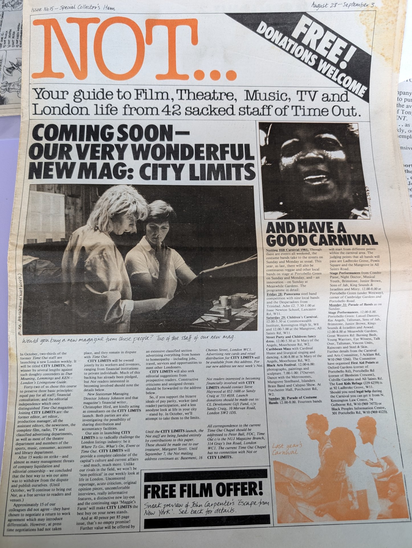 By that point at the end of August 1981, the failure to reach any agreement with Elliot meant the strikers had decided to start their own listings magazine, City Limits. Elliot hired a bunch of new staff hired at those different rates and Time Out resumed publication.. just too late to feature the start of a new community.