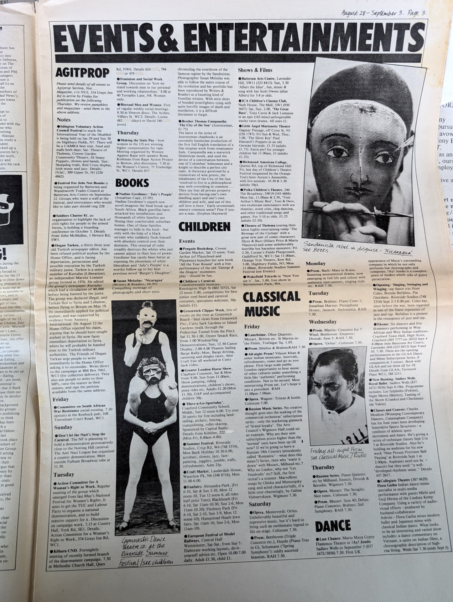 The first couple of issues were tiny (at least in page count – all the issues used newspaper presses and were roughly tabloid sized newsprint compared to the smaller glossy paper used for Time Out) and focused on the strikers' case, but soon grew into a listings magazine. Its coverage was patchy, but did in its 15th issue, covering 28th August to 3rd September..