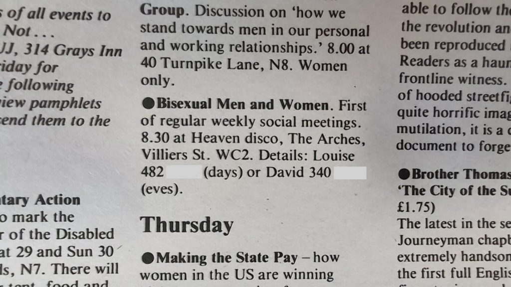 For the three months before the London Bisexual Group's first meeting in September 1981 my phone number was used in small advertisements in Time Out and Gay News announcing the event.